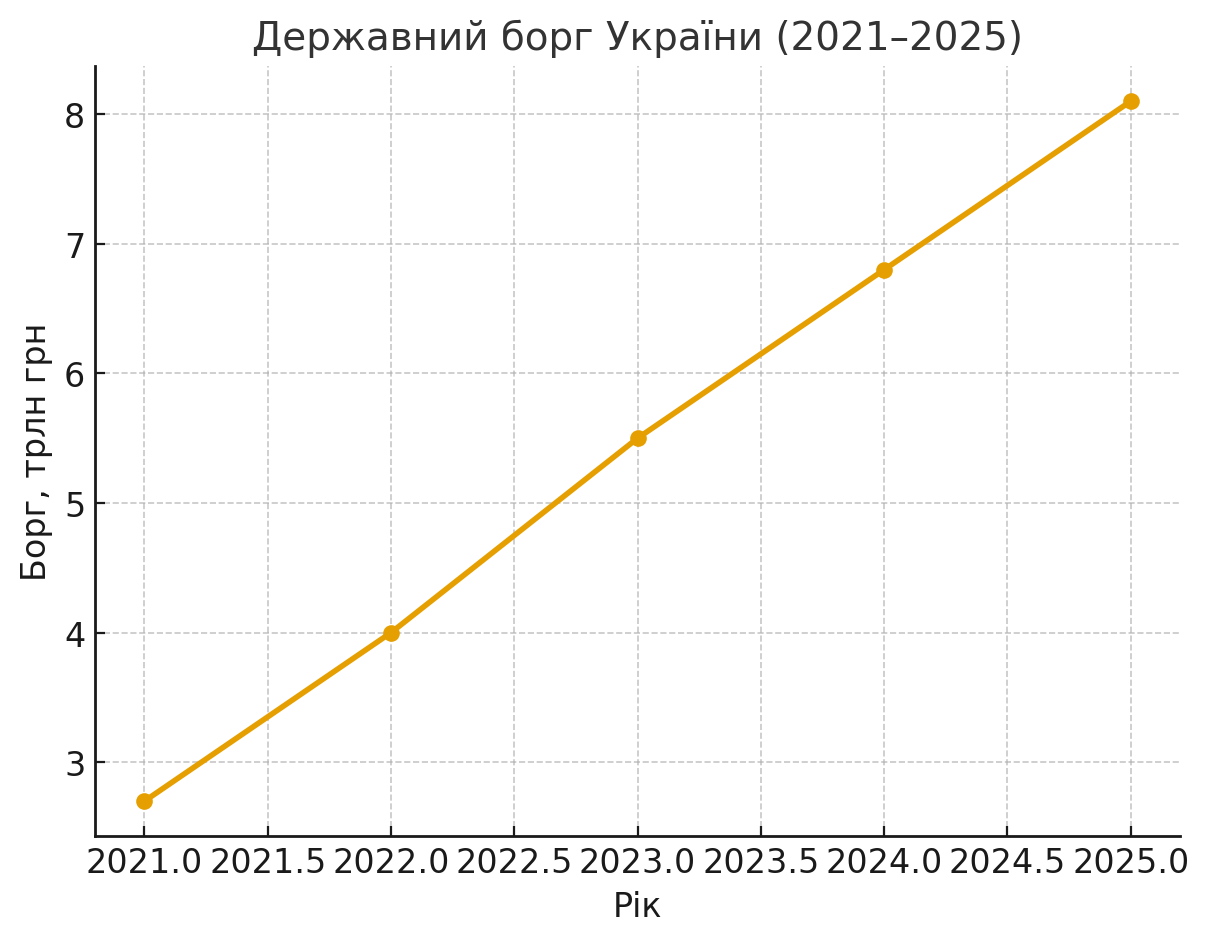 Ось інфографіка, що показує, як державний борг України зріс із 2,7 трлн грн у 2021 році до понад 8 трлн грн у 2025-му — це більш ніж утричі за чотири роки.