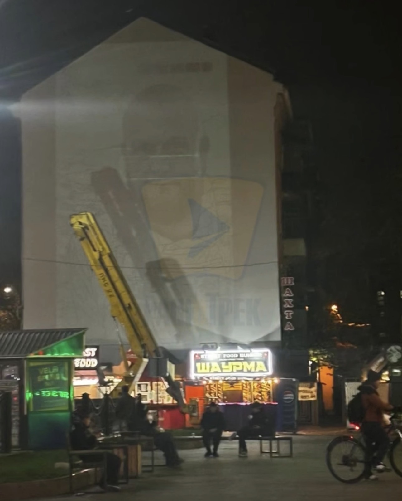 Сьогодні вночі на місці помітили проектор, який висвічував на стіні контури муралу Давидюка. Схоже, його готувалися нанести.