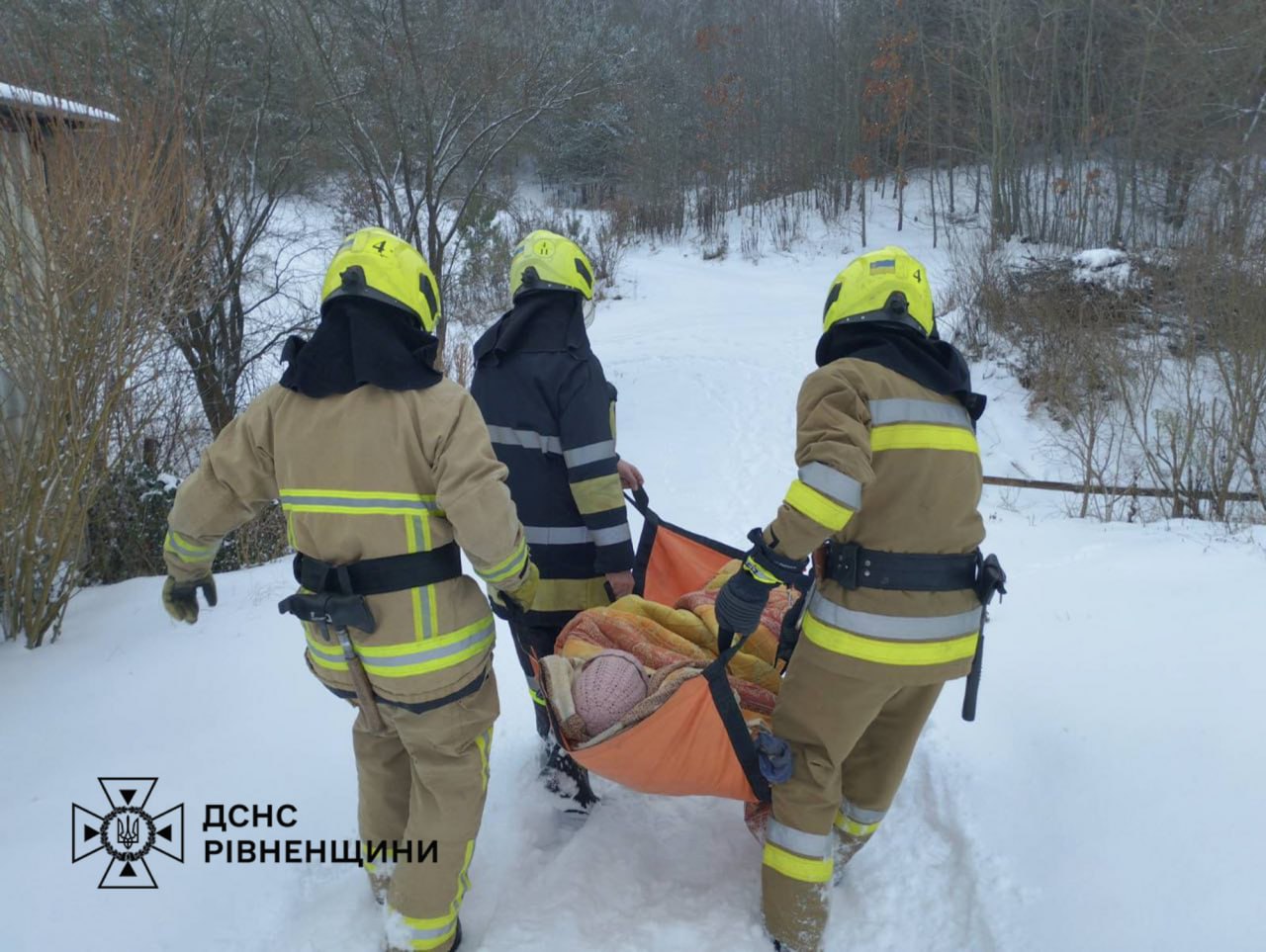 Рятувальники з Клеваня оперативно прибули на місце події та на винесли жінку з оселі до автомобіля. Після цього бійці ДСНС відбуксирували спецтранспорт медиків на проїжджу частину дороги.