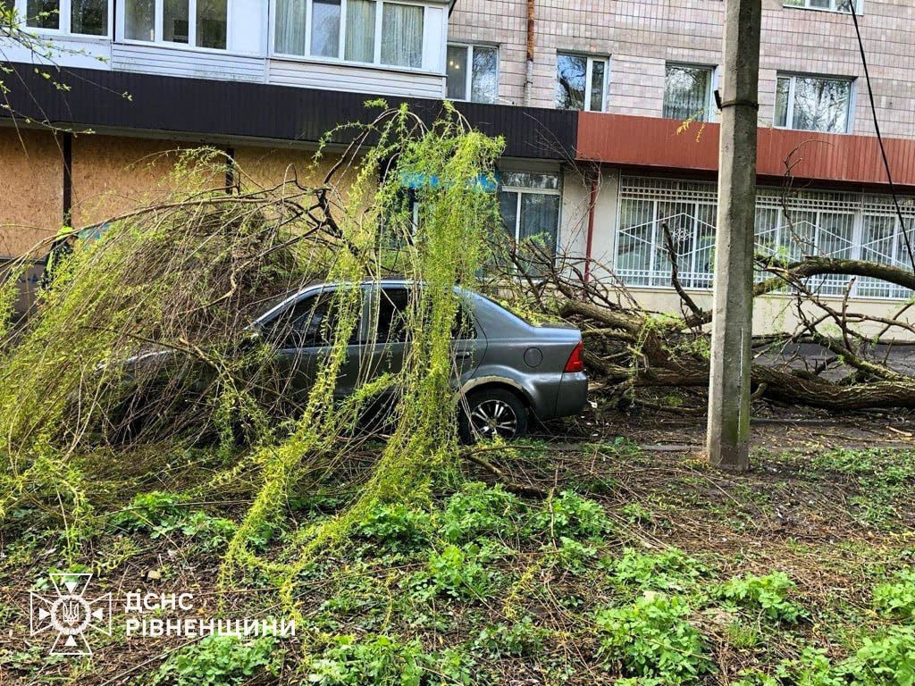 У Рівному прибрано дерево з пошкодженого автомобіля та знято аварійні елементи балконів і покрівель за трьома адресами. У с. Суховоля частину дерева зняли з житлового будинку.